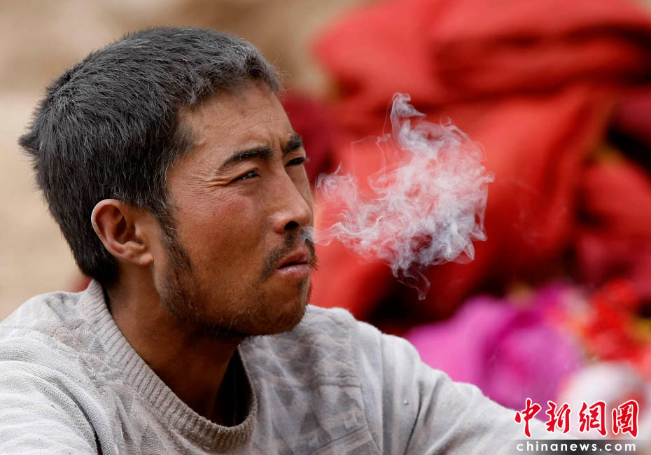 2010年4月16日,青海玉樹藏族自治州玉樹縣結(jié)古鎮(zhèn)一所中學(xué)的震災(zāi)救援現(xiàn)場,一名救援人員在短暫的休息期間吸煙解乏。中新社發(fā) 盛佳鵬 攝