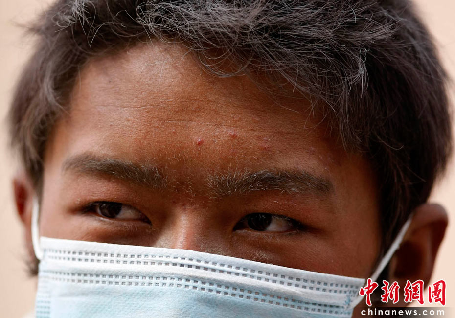2010年4月16日,青海玉樹藏族自治州玉樹縣結(jié)古鎮(zhèn)一所中學(xué)的震災(zāi)救援現(xiàn)場(chǎng),救援人員的頭發(fā)、眉毛都落滿塵土。中新社發(fā) 盛佳鵬 攝