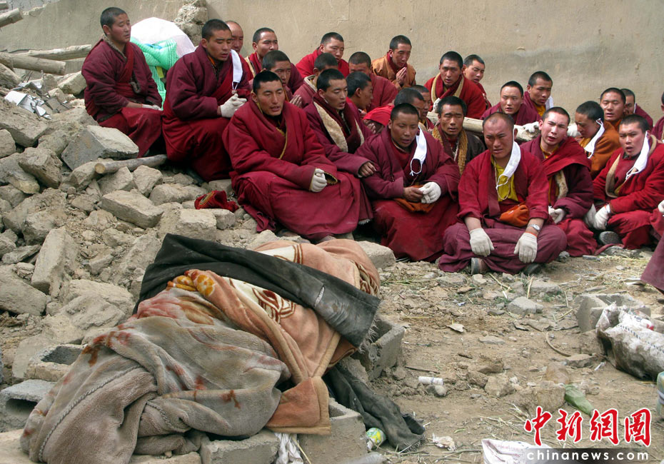 4月16日,青海玉樹(shù)震區(qū)僧侶們?cè)趶U墟邊為地震遇難者按藏族習(xí)俗進(jìn)行超度。中新社發(fā) 孫自法 攝