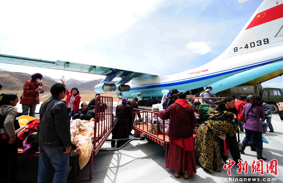 4月16日15時(shí),青海玉樹(shù)機(jī)場(chǎng),149名藏族重傷員準(zhǔn)備乘坐廣空運(yùn)輸航空兵某師兩架伊爾-76型運(yùn)輸機(jī)飛往格爾木機(jī)場(chǎng)。中新社發(fā) 沈玲 攝