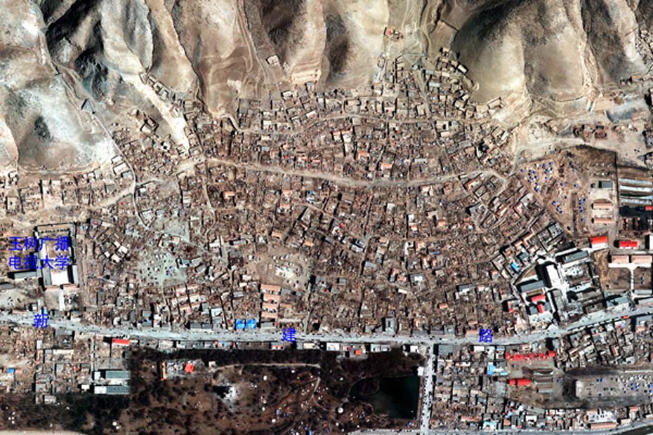 利用對(duì)地觀測(cè)中心2010年4月16日獲取的高分辨率航空遙感數(shù)據(jù),提取出玉樹(shù)州結(jié)古鎮(zhèn)城區(qū)范圍內(nèi)地震破壞最嚴(yán)重或典型地區(qū),使之與GoogleEarth中相應(yīng)位置的震前遙感衛(wèi)星數(shù)據(jù)進(jìn)行對(duì)比,直觀展現(xiàn)結(jié)古鎮(zhèn)在此次地震中的受影響程度。圖片來(lái)源:中國(guó)科學(xué)院