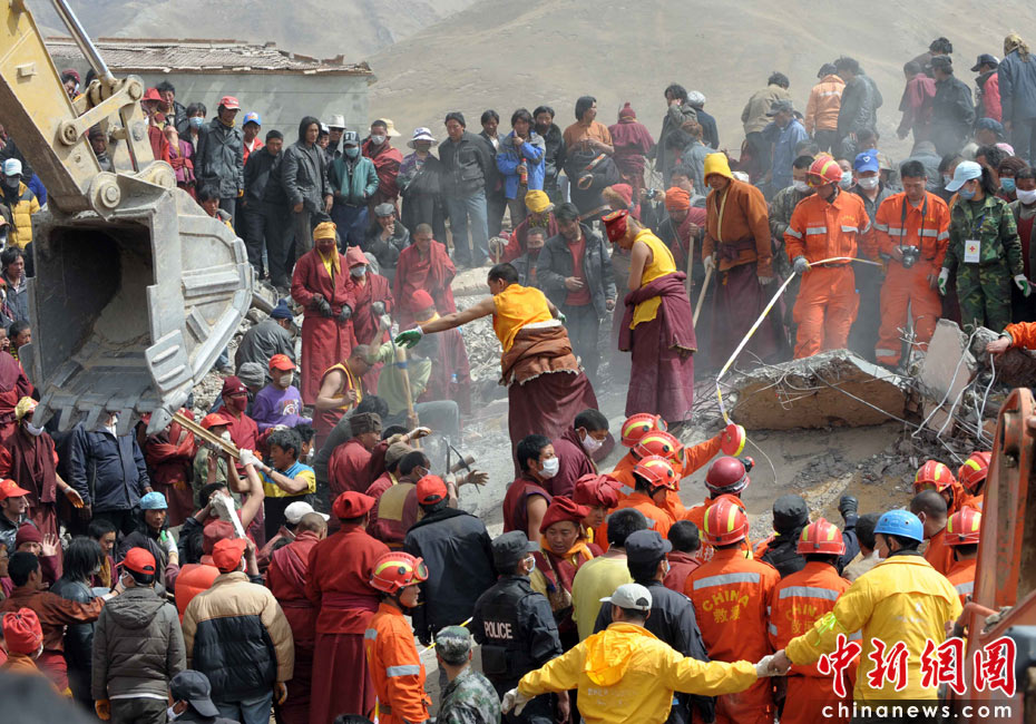 4月17日,中國地震救援隊(duì)、四川救援隊(duì)在玉樹結(jié)古鎮(zhèn)三岔路城建一號商鋪展開搜救,救援隊(duì)員、僧人、志愿者等在同一搜救點(diǎn)連續(xù)奮戰(zhàn)。中新社發(fā) 陳文 攝