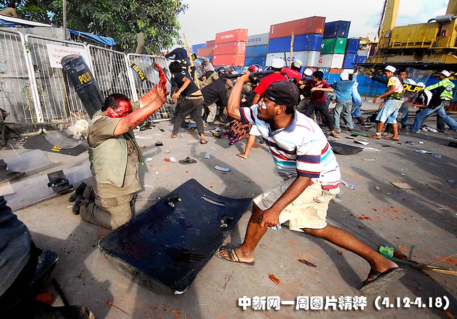 4月14日周三,在印度尼西亞首都雅加達(dá),一名示威者在沖突中毆打一名警員。示威者手持砍刀和棍棒,抗議政府試圖拆除一名18世紀(jì)阿拉伯伊斯蘭傳教士的墳?zāi)埂?/p>