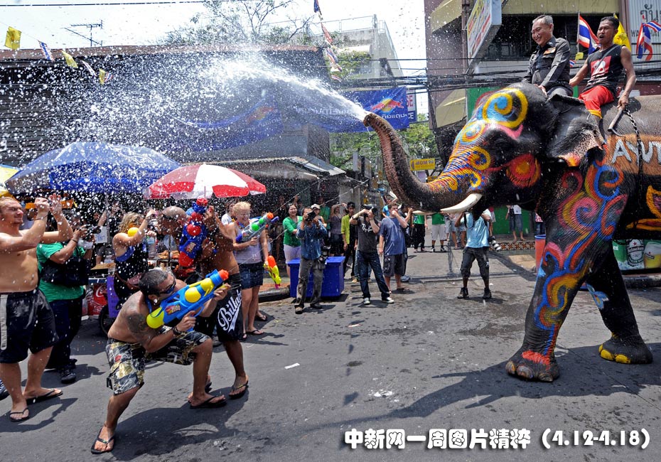 4月12日周一的泰國曼谷,一只大象在街頭向游人噴水。周二泰國將迎來一年一度的潑水節(jié),這是慶祝泰國新年的節(jié)日。