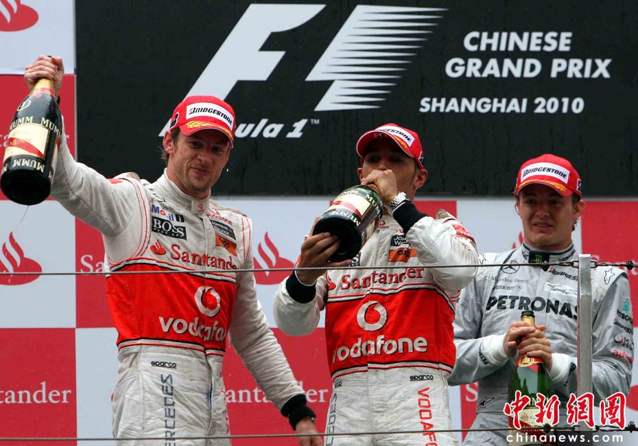 4月18日下午,2010國際汽聯(lián)F1世界錦標(biāo)賽上海站在上海國際賽車場舉行正式比賽,邁凱輪車隊的英國車手巴頓(左)在雨中獲得冠軍、隊友、英國車手漢密爾頓(中)獲得亞軍,梅賽德斯GP車隊的德國車手羅斯伯格獲得季軍。中新社記者 任晨鳴 攝