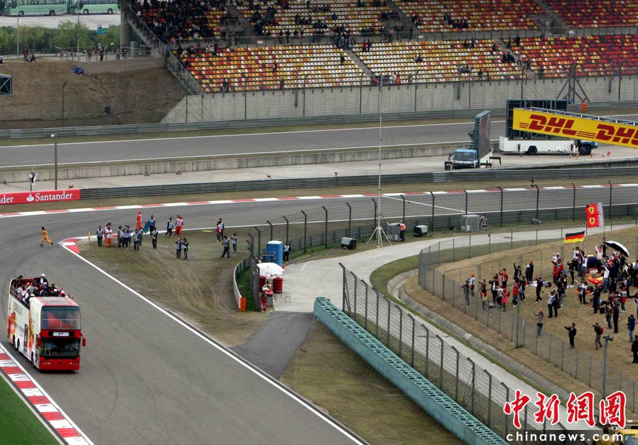 4月18日下午,2010國際汽聯(lián)F1世界錦標賽上海站在上海國際賽車場舉行正式比賽,賽前24名參賽車手按照慣例乘坐敞篷車環(huán)繞賽場一周與車迷見面,但是寥寥無幾的觀眾與陰沉的天氣使上海F1賽事創(chuàng)下開賽七年以來觀眾人數(shù)最低的紀錄。中新社記者 任晨鳴 攝
