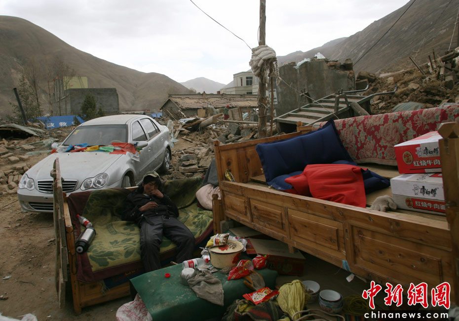 4月18日,玉樹(shù)結(jié)古鎮(zhèn)一男孩在家中的“客廳”上休息。地震后,他們將必需的起居用品搬到戶(hù)外。中新社發(fā) 蘇丹 攝