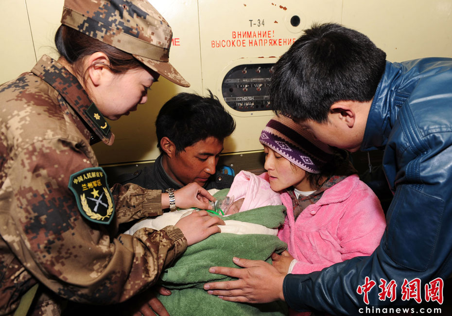 4月18日上午9點(diǎn)10分,剛剛到達(dá)玉樹機(jī)場(chǎng)正在卸下救災(zāi)物資的廣空運(yùn)輸航空兵某師劉軍機(jī)組,聽(tīng)說(shuō)有名早產(chǎn)兒急需轉(zhuǎn)送蘭州軍區(qū)總醫(yī)院救治,僅用15分鐘準(zhǔn)備,9點(diǎn)25分飛機(jī)提前起飛。懷孕8個(gè)多月藏族婦女尼瑪拉毛,由于地震驚嚇導(dǎo)致早產(chǎn)。當(dāng)日凌晨4點(diǎn)轉(zhuǎn)院途中,在蘭州軍區(qū)323醫(yī)院婦產(chǎn)醫(yī)生王小特、盧小娟的幫助下,產(chǎn)下一男嬰。由于早產(chǎn)、產(chǎn)程長(zhǎng),嬰兒嚴(yán)重缺氧,發(fā)生紫疳,為了盡快挽救嬰兒生命,準(zhǔn)備轉(zhuǎn)往蘭州軍區(qū)總醫(yī)院。圖為蘭州軍區(qū)323醫(yī)院救護(hù)隊(duì)員隨機(jī)救護(hù)。中新社發(fā) 沈玲 攝