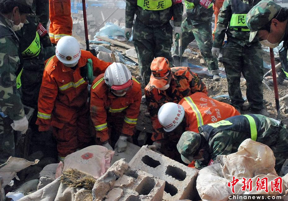 西藏公安消防部隊近日赴玉樹抗震救災分隊103名官兵分成5個小組在不同區(qū)域展開搜救。圖為西藏消防救援官兵與當地民兵一起救援。中新社發(fā) 劉毅 攝