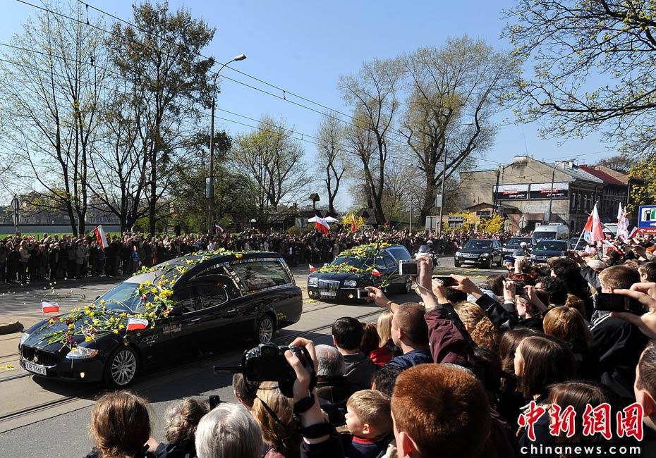 當(dāng)?shù)貢r(shí)間4月18日,卡欽斯基夫婦的葬禮在波蘭南部城市克拉科夫舉行。波蘭總統(tǒng)卡欽斯基及其夫人乘坐的專(zhuān)機(jī)10日在俄羅斯斯摩棱斯克失事,機(jī)上人員全部遇難。圖片來(lái)源:中國(guó)新聞網(wǎng)