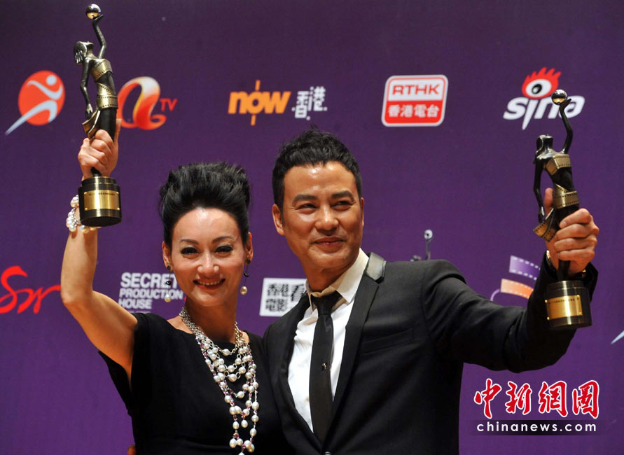 4月18日晚,“第二十九屆香港電影金像獎”頒獎典禮在香港文化中心大劇院隆重舉行。分別奪得最佳男女主角獎項的香港藝人任達華及惠英紅向媒體展示獎項并合照。中新社發(fā) 鄧慶樂 攝