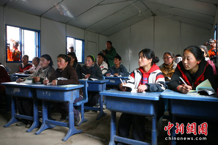 4月18日,70多名孩子在地震四天后重新走進(jìn)了課堂,玉樹州孤兒學(xué)校成為了地震災(zāi)區(qū)第一所復(fù)課的學(xué)校,剛完成帳篷搭建的青海省玉樹藏族自治州第一民族中學(xué)3個(gè)年級(jí)的學(xué)生也開始復(fù)課。青友 攝