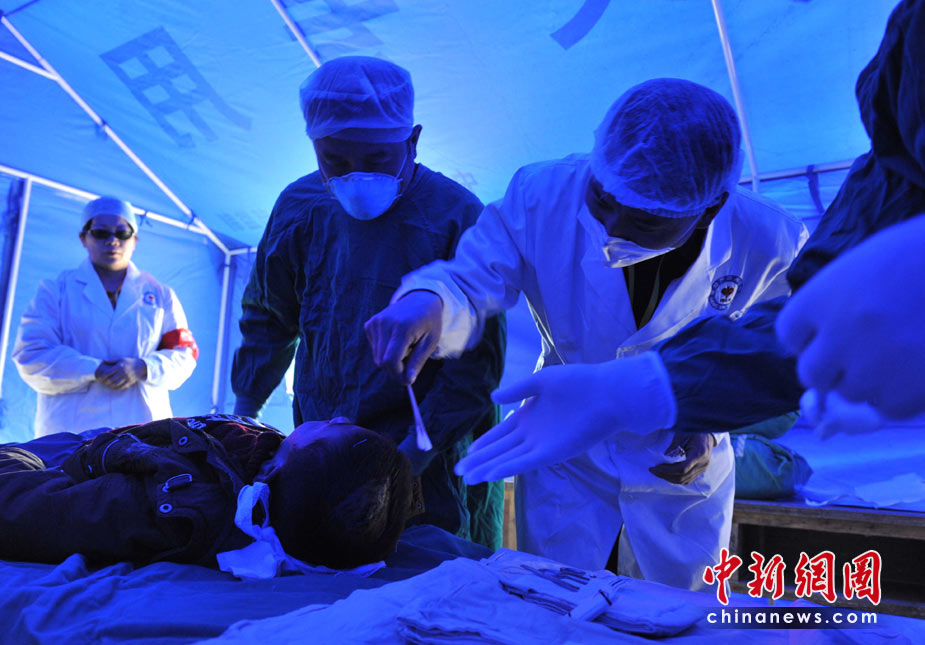 四川省綿陽市中心醫(yī)院院長王東率領(lǐng)的醫(yī)療救護(hù)隊,正在為一名身上遭受多處地震創(chuàng)傷的玉樹藏族男孩換藥。他們借助汶川大地震的救護(hù)經(jīng)驗(yàn),援助青海玉樹縣醫(yī)院展開4月中旬的抗震救災(zāi)。中新社發(fā) 賈國榮 攝