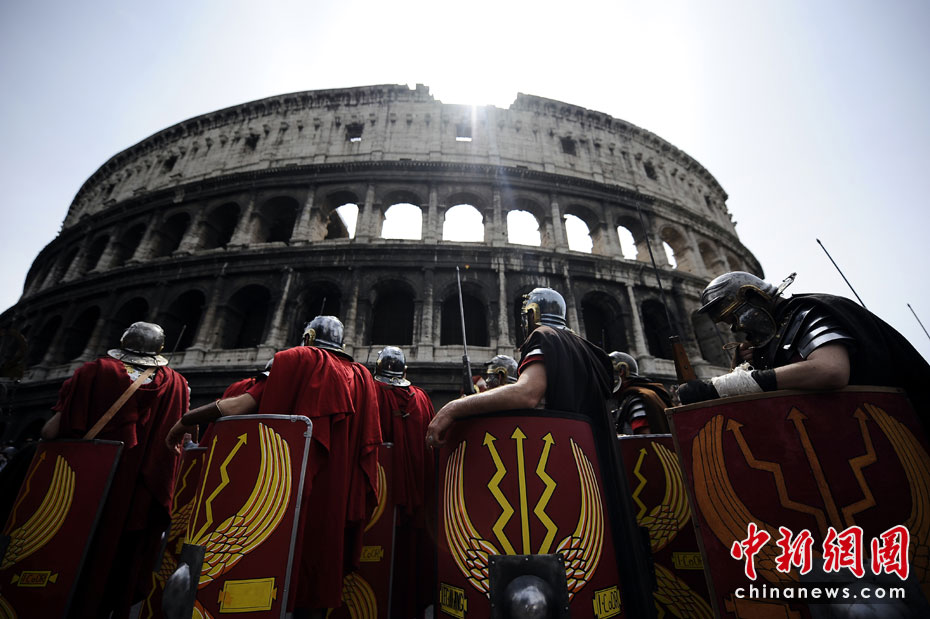 4月18日,意大利羅馬,男子打扮成武士在圓形競(jìng)技場(chǎng)附近參加游行,慶祝羅馬建城2763周年。圖片來源:中國(guó)新聞網(wǎng)