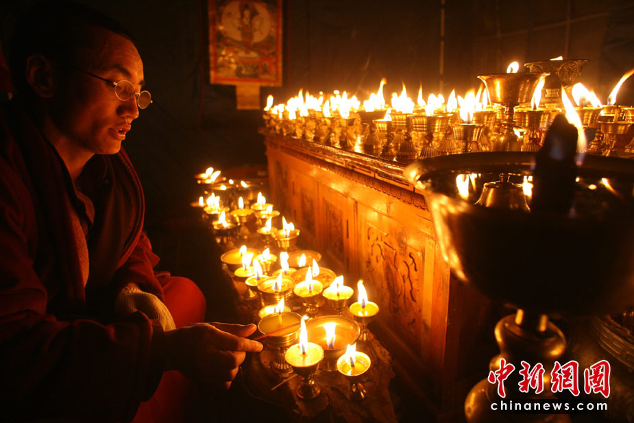 4月18日晚,玉樹(shù)僧人為地震遇難者供燈。當(dāng)日,民眾自發(fā)在結(jié)古鎮(zhèn)格薩爾王廣場(chǎng)舉行酥油燈法會(huì),悼念地震遇難者。中新社發(fā) 蘇丹 攝