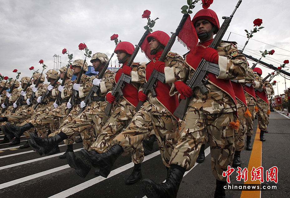 4月18日,伊朗德黑蘭舉行伊朗建軍節(jié)閱兵式。伊朗在閱兵式上展出了“力量”、“流星”和“泥石”等地對(duì)地導(dǎo)彈。圖片來源:中國新聞網(wǎng)