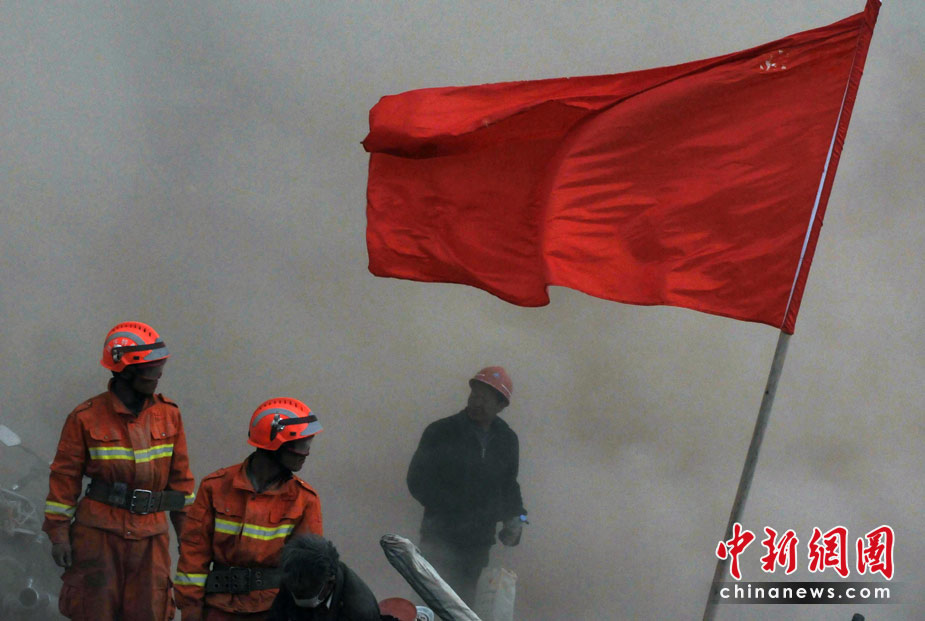 4月中旬青海玉樹地震災(zāi)區(qū)風(fēng)沙迷漫,各地救援隊在結(jié)古鎮(zhèn)災(zāi)區(qū)煙塵中堅持抗震救災(zāi)。中新社發(fā) 賈國榮 攝