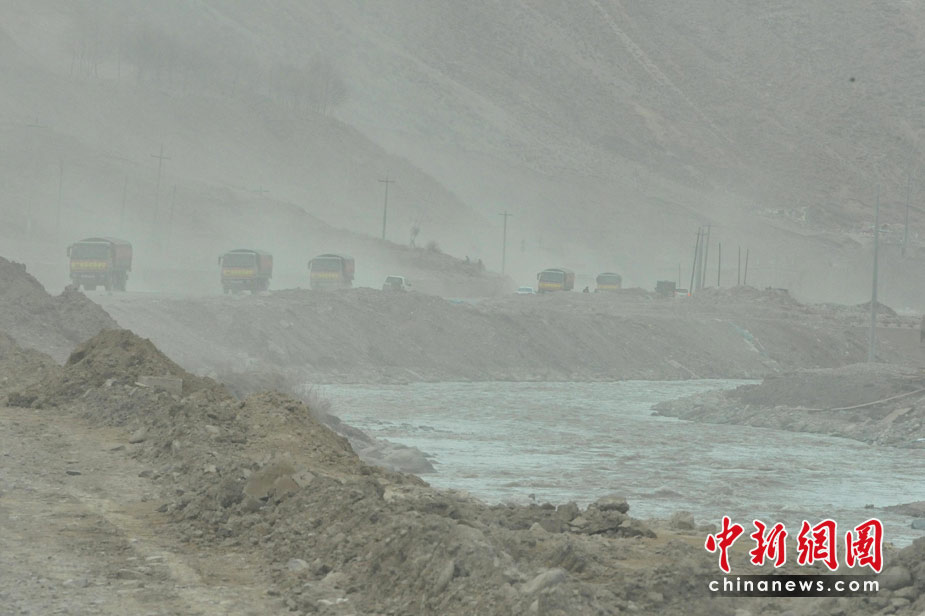 4月中旬青海玉樹地震災(zāi)區(qū)風(fēng)沙迷漫,中國各地軍民車隊在風(fēng)塵滾滾中馳援青藏高原偏僻一角的玉樹,艱難開通抗震救災(zāi)大通道。中新社發(fā) 賈國榮 攝