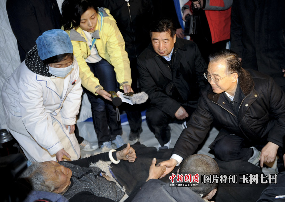4月15日20時(shí),中國(guó)國(guó)務(wù)院總理溫家寶來(lái)到青海省玉樹縣玉樹自治州醫(yī)院看望受災(zāi)民眾。這是溫家寶握著一位藏族大媽的手問候其身體情況。國(guó)務(wù)院副總理回良玉、國(guó)務(wù)委員孟建柱參加看望慰問。中新社發(fā) 廖攀 攝