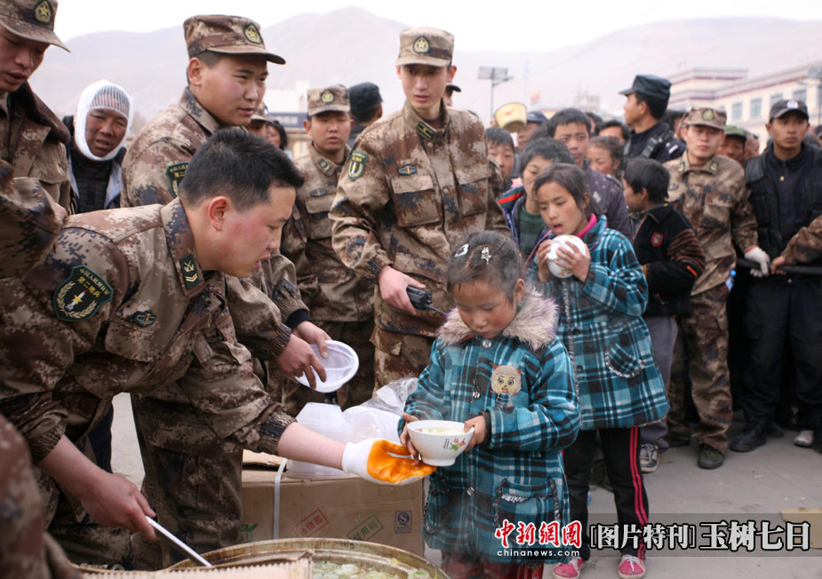 4月16日,青海省玉樹藏族自治州玉樹縣地震發(fā)生第三天,為確保災(zāi)民有飯吃、有帳篷住,玉樹城內(nèi)各個(gè)安置點(diǎn)架起鍋灶為受災(zāi)民眾分發(fā)免費(fèi)食物并幫助搭建帳篷。中新社發(fā) 劉忠俊 攝