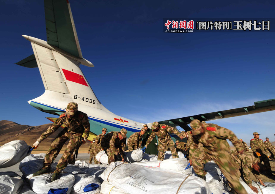 4月17日凌晨6點開始,空軍緊急出動飛機8架,飛行8架次,截止到中午12點,共運送帳篷1080頂,救災(zāi)器材20噸,野戰(zhàn)食品24噸,共計158噸。據(jù)玉樹氣象臺預(yù)報,災(zāi)區(qū)當(dāng)日下午到夜間有陣雨,19日白天至夜間有小到中雪,氣溫將降到零度以下。中新社發(fā) 沈玲 攝