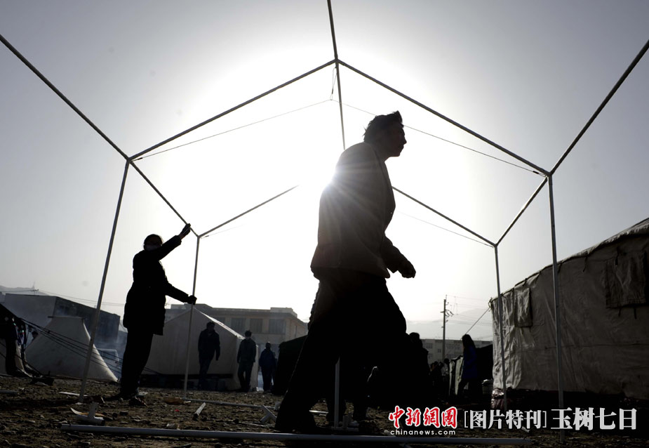 青海玉樹縣體育場的地震災(zāi)民安置點(diǎn)內(nèi),玉樹地震災(zāi)民正在積極自建抗震帳棚。中新社發(fā) 廖攀 攝