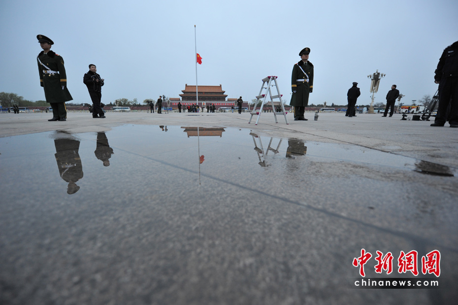 4月21日早晨,北京天安門(mén)廣場(chǎng)下半旗向玉樹(shù)地震遇難者致哀。中新網(wǎng)記者 金碩 攝