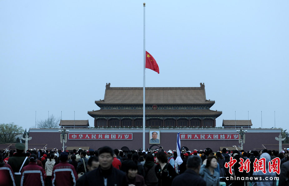 4月21日,北京天安門廣場(chǎng)升國(guó)旗儀式結(jié)束后,下半旗向玉樹地震遇難同胞志哀。為表達(dá)全國(guó)各族人民對(duì)青海玉樹地震遇難同胞的深切哀悼,中國(guó)國(guó)務(wù)院決定,舉行全國(guó)哀悼活動(dòng),全國(guó)和駐外使領(lǐng)館下半旗志哀,停止公共娛樂活動(dòng)。中新社發(fā) 劉震 攝