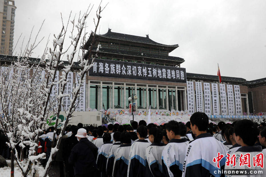 21日上午9時許,西寧各界民眾冒雪陸續(xù)來到該市最大的廣場——新寧廣場,悼念玉樹地震遇難同胞。中新社記者 符永康 攝