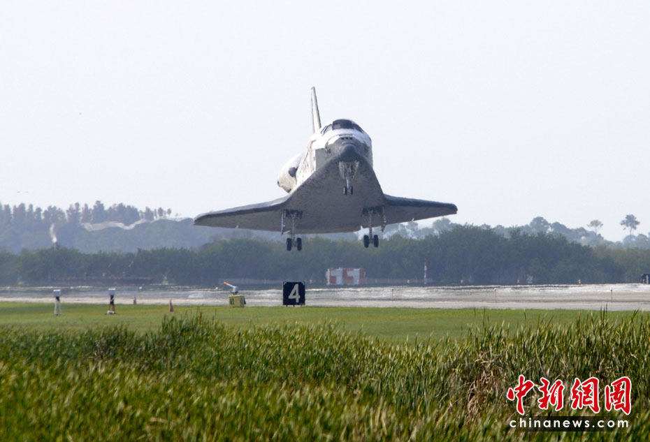 美國發(fā)現(xiàn)號航天飛機于當?shù)貢r間4月20日成功降落在佛羅里達州肯尼迪航天中心,結(jié)束了為期15天的國際空間站建設(shè)之旅。圖片來源:中國新聞網(wǎng)