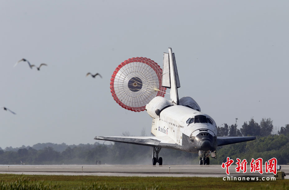 美國發(fā)現(xiàn)號航天飛機于當(dāng)?shù)貢r間4月20日成功降落在佛羅里達州肯尼迪航天中心,結(jié)束了為期15天的國際空間站建設(shè)之旅。圖片來源:中國新聞網(wǎng)