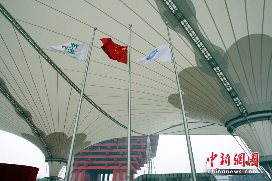 4月21日,上海世博園區(qū)降半旗哀悼玉樹(shù)地震遇難者。當(dāng)日,全國(guó)舉行哀悼活動(dòng),深切哀悼青海玉樹(shù)地震遇難同胞。中新社發(fā) 湯彥俊 攝