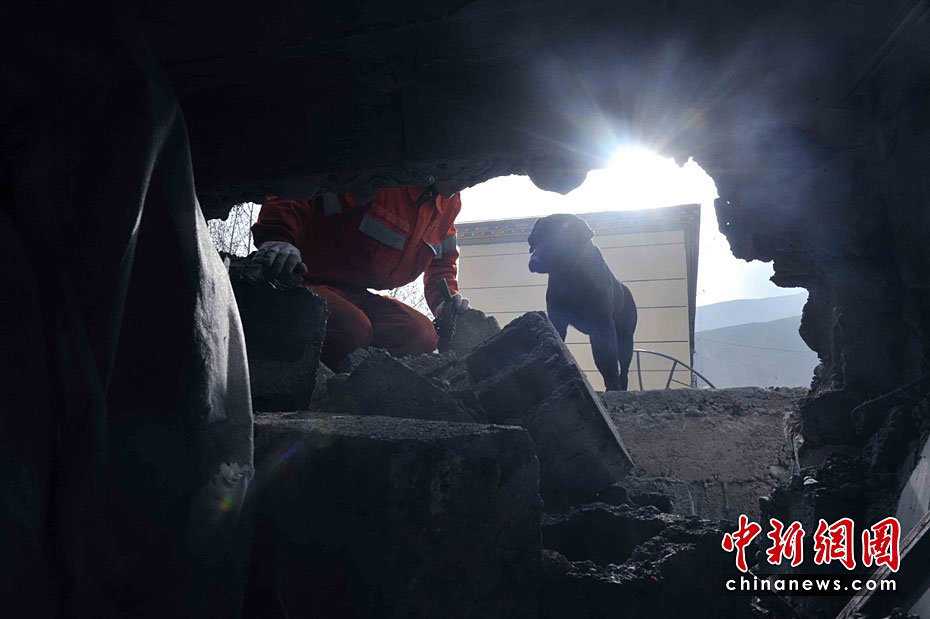 名貴的黑貝犬是中國(guó)國(guó)家救援隊(duì)趕赴青海玉樹地震災(zāi)區(qū)6只搜救犬隊(duì)成員之一,身價(jià)近百萬(wàn)元人民幣。4月21日清晨八時(shí)許,它在救援隊(duì)員的帶領(lǐng)下,到玉樹地震災(zāi)區(qū)中心商業(yè)街廢墟里,四處奔波,盡職盡力尋找生命跡象。10時(shí)后,他和救援隊(duì)員都出現(xiàn)高原反應(yīng),暫時(shí)休整,準(zhǔn)備再戰(zhàn)。賈國(guó)榮 攝