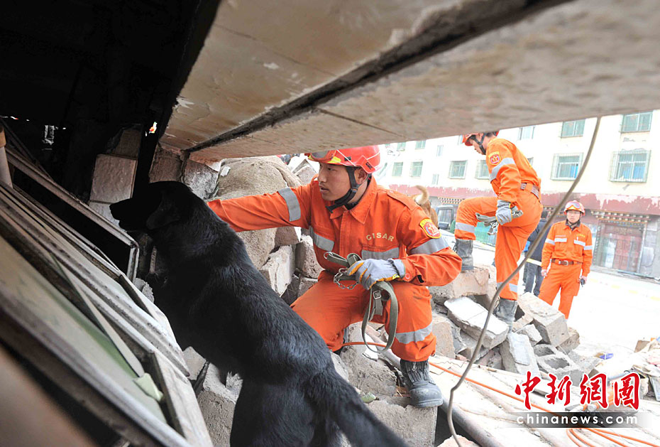 名貴的黑貝犬是中國國家救援隊趕赴青海玉樹地震災(zāi)區(qū)6只搜救犬隊成員之一,身價近百萬元人民幣。4月21日清晨八時許,它在救援隊員的帶領(lǐng)下,到玉樹地震災(zāi)區(qū)中心商業(yè)街廢墟里,四處奔波,盡職盡力尋找生命跡象。10時后,他和救援隊員都出現(xiàn)高原反應(yīng),暫時休整,準(zhǔn)備再戰(zhàn)。賈國榮 攝