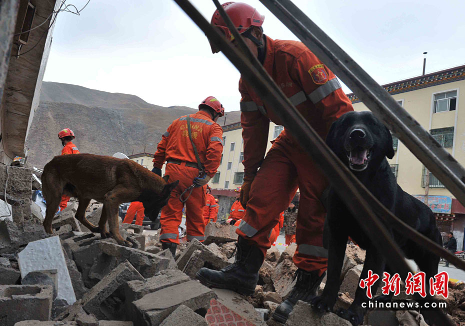 名貴的黑貝犬是中國國家救援隊(duì)趕赴青海玉樹地震災(zāi)區(qū)6只搜救犬隊(duì)成員之一,身價(jià)近百萬元人民幣。4月21日清晨八時(shí)許,它在救援隊(duì)員的帶領(lǐng)下,到玉樹地震災(zāi)區(qū)中心商業(yè)街廢墟里,四處奔波,盡職盡力尋找生命跡象。10時(shí)后,他和救援隊(duì)員都出現(xiàn)高原反應(yīng),暫時(shí)休整,準(zhǔn)備再戰(zhàn)。賈國榮 攝