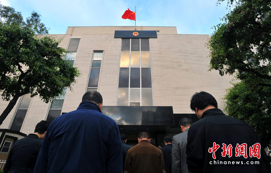 當?shù)貢r間4月21日清晨,中國駐洛杉磯總領事館在總領館大樓前舉行降半旗儀式,向青海玉樹地震遇難同胞表示深切悼念。中新社發(fā) 張煒 攝