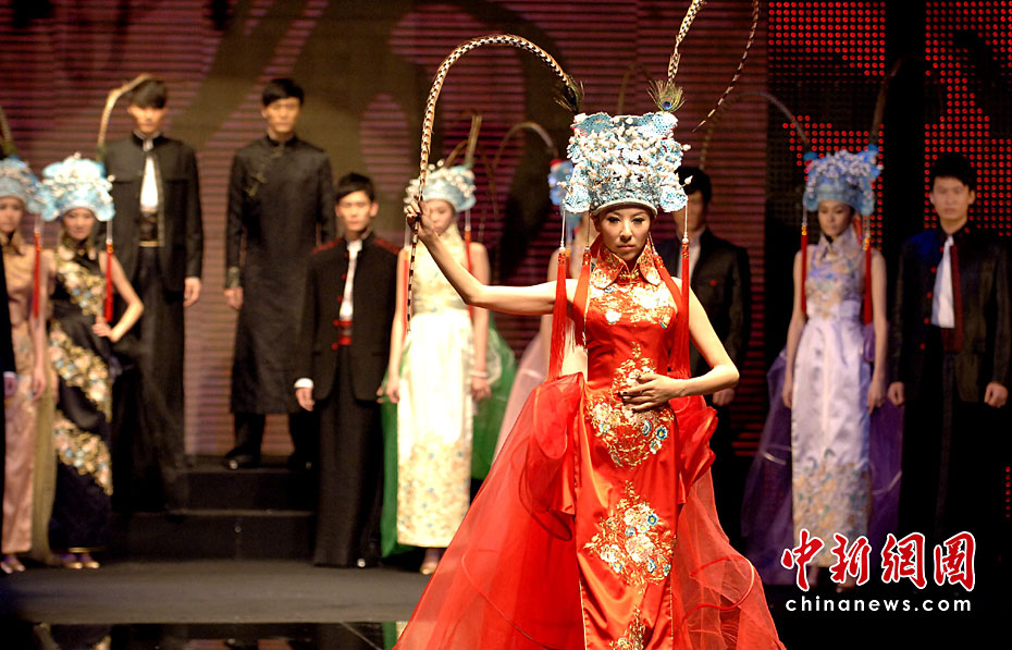 4月20日晚,首屆海西國際時裝周在福建石獅閉幕,本屆時裝周吸引了來自海峽兩岸的紡織服裝界企業(yè)家和知名服裝設計師。期間舉辦了12場時裝品牌和設計師作品動態(tài)發(fā)布會。圖為模特展示古今潮流結合的服裝。王東明 攝
