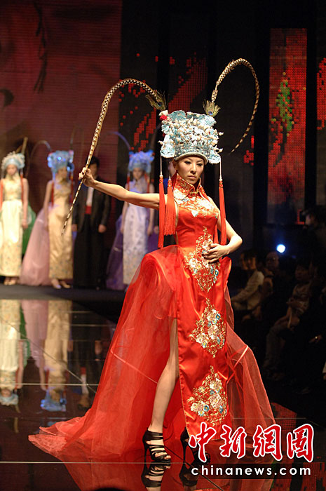 4月20日晚,首屆海西國際時(shí)裝周在福建石獅閉幕,本屆時(shí)裝周吸引了來自海峽兩岸的紡織服裝界企業(yè)家和知名服裝設(shè)計(jì)師。期間舉辦了12場時(shí)裝品牌和設(shè)計(jì)師作品動(dòng)態(tài)發(fā)布會(huì)。圖為模特展示古今潮流結(jié)合的服裝。王東明 攝