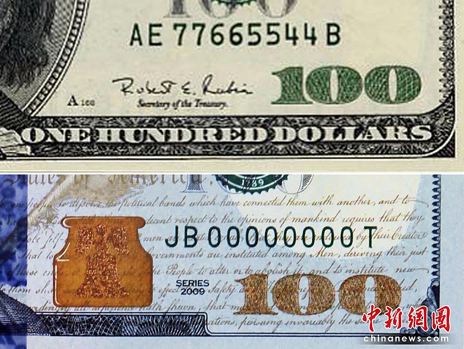 圖為新(下)舊款百元美鈔對比。