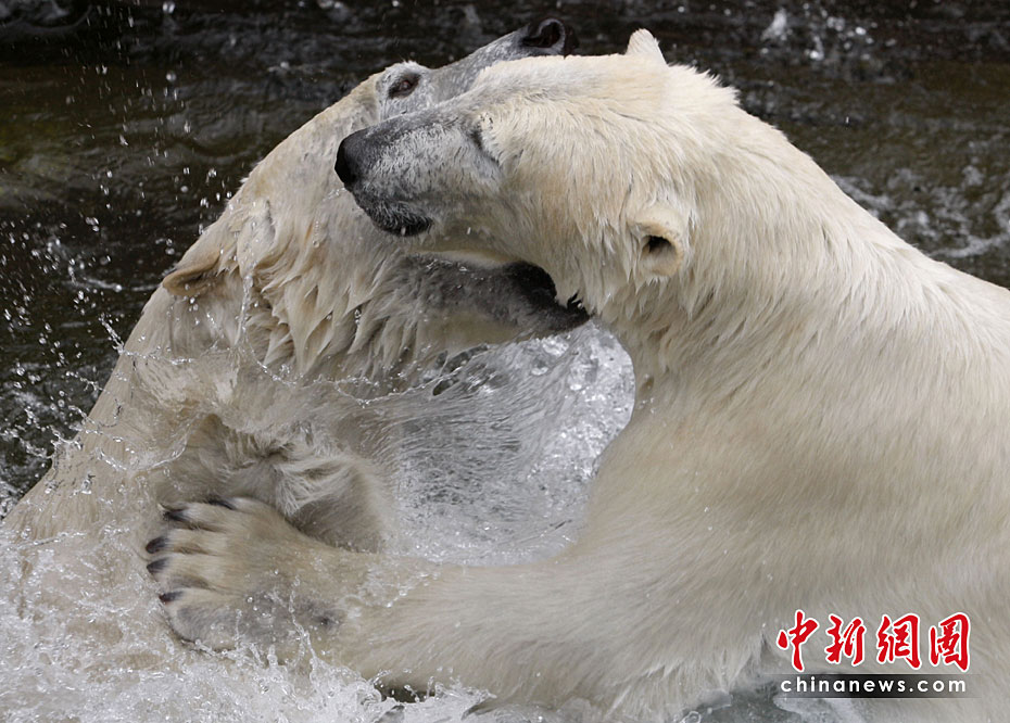 4月23日,德國(guó)紐倫堡動(dòng)物園內(nèi),兩頭北極熊在公園內(nèi)的水池中盡情玩耍,享受春天的陽(yáng)光。圖片來(lái)源:中國(guó)新聞網(wǎng)