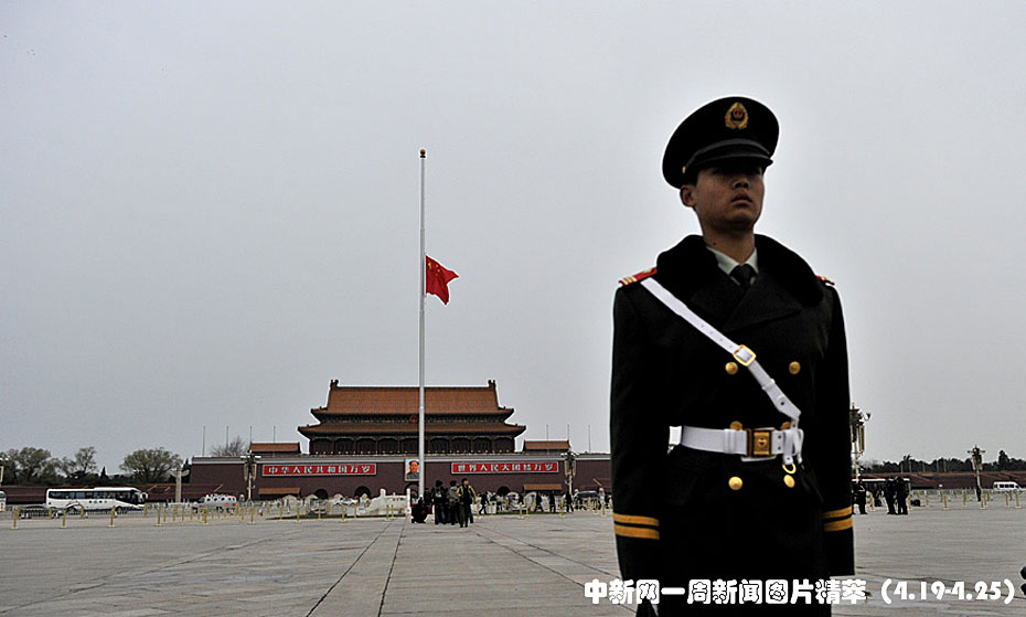 周三(21日),北京天安門(mén)廣場(chǎng)下半旗向玉樹(shù)地震遇難者致哀。