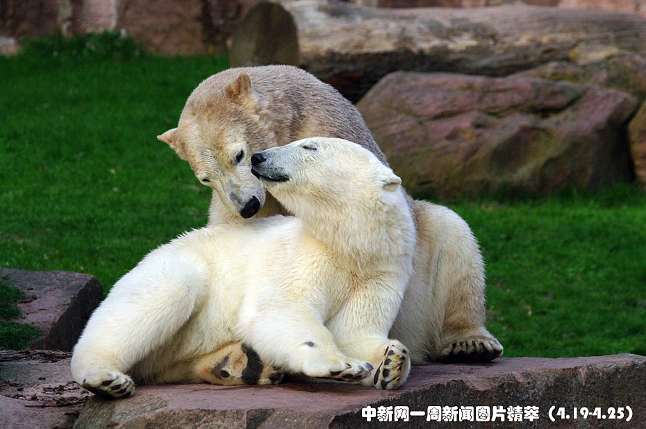 周五(23日),德國紐倫堡動物園內(nèi),兩頭北極熊在公園內(nèi)的水池中盡情玩耍,享受春天的陽光。