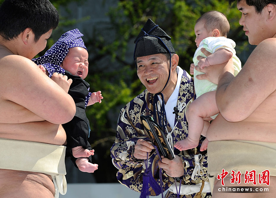 4月25日,日本東京,幾名相撲手手抱嬰兒,正努力使嬰兒哭泣。當日,一年一度的日本一周歲以下嬰兒啼哭大賽在東京淺草寺舉行。第一個讓嬰兒哭泣的選手將贏得比賽,日本通過此種比賽為孩子的健康祈福,他們認為嬰兒哭泣將對他們將來的身體健康有利。圖片來源:中國新聞網