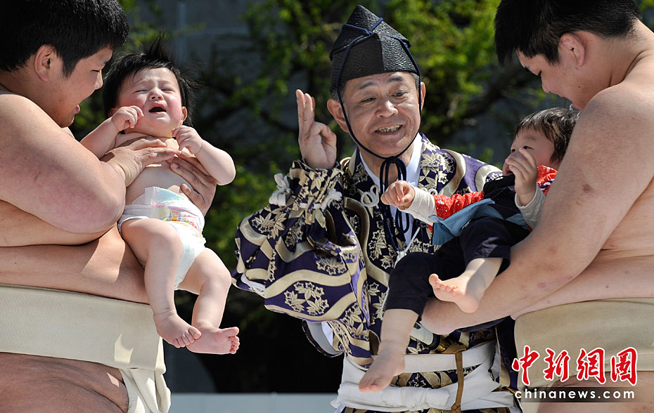 4月25日,日本東京,幾名相撲手手抱嬰兒,正努力使嬰兒哭泣。當(dāng)日,一年一度的日本一周歲以下嬰兒啼哭大賽在東京淺草寺舉行。第一個(gè)讓嬰兒哭泣的選手將贏得比賽,日本通過(guò)此種比賽為孩子的健康祈福,他們認(rèn)為嬰兒哭泣將對(duì)他們將來(lái)的身體健康有利。圖片來(lái)源:中國(guó)新聞網(wǎng)
