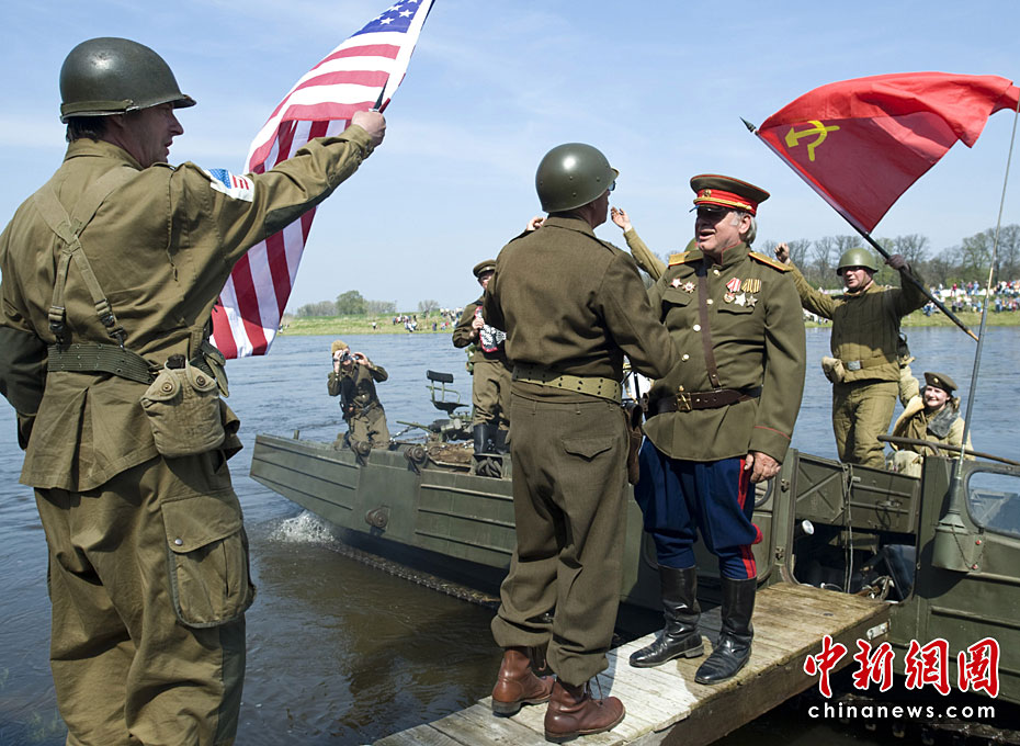 德國當(dāng)?shù)貢r(shí)間4月24日,演員身著二戰(zhàn)時(shí)期美蘇軍裝在德國托爾高南部易北河畔的一座小橋上重現(xiàn)當(dāng)年的“會師”一幕。