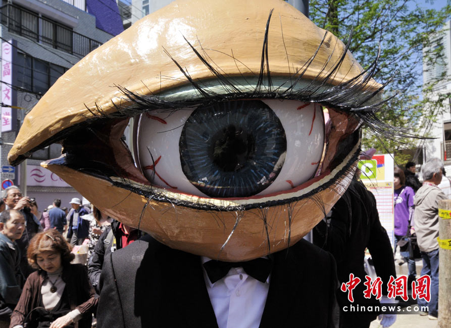 4月26日,日本一個表演藝術(shù)團體扮成“獨眼怪人”在街頭亮相,大玩行為藝術(shù)。