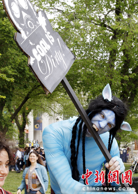 2010年4月25日,在美國首都華盛頓,兩名扮成電影《阿凡達》里納美人模樣的演員參加“氣候集會”演唱會。當天,華盛頓舉行演唱會,紀念“世界地球日”。4月22日是第41個“世界地球日”。