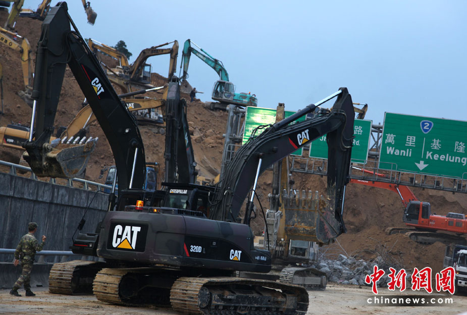 4月27日,臺灣“北二高”基隆段山體大滑坡意外第3天,開挖搜救風(fēng)雨無阻、持續(xù)進(jìn)行,消防部門陸續(xù)接獲民眾報(bào)告,疑似5車6人被深埋,包括兩輛奔馳轎車、一對年輕情侶。圖為軍方出動(dòng)大型機(jī)械車參與挖掘工作。中新社發(fā) 董會(huì)峰 攝