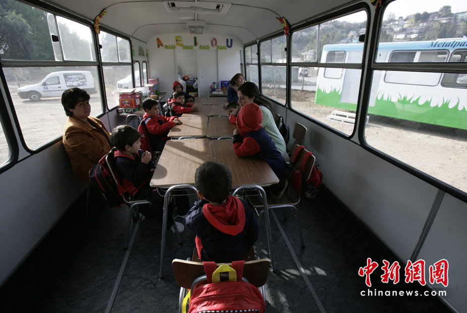 4月26日,今年2月遭受8.8級強烈地震的智利康塞普西翁市,兒童們在“巴士學!崩锷险n。