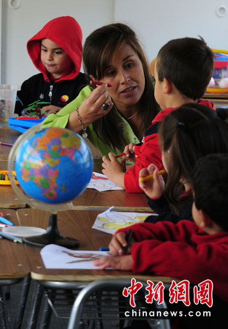4月26日,今年2月遭受8.8級(jí)強(qiáng)烈地震的智利康塞普西翁市,兒童們?cè)凇鞍褪繉W(xué)!崩锷险n。